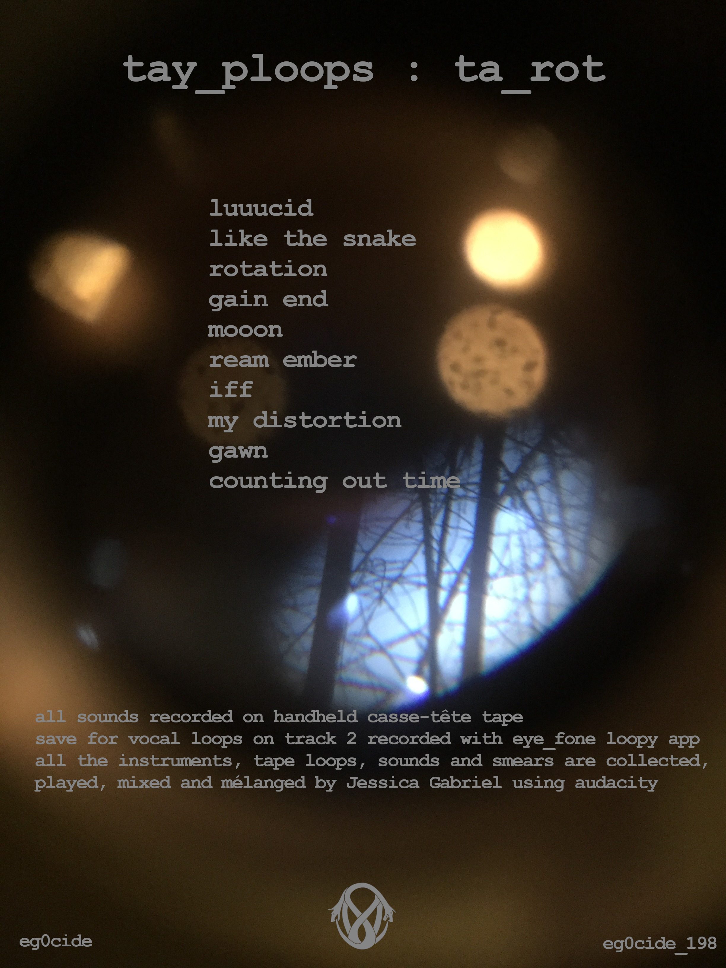 Tay_ploops is a solo project of multidisciplinary Canadian artist (painter, performer, puppeteer, musician) Jessica Gabriel. She initially conceived Ta_rot as a concept album of sad experimental songs to be released on 30 november 2018, for the international remembrance day for lost species.